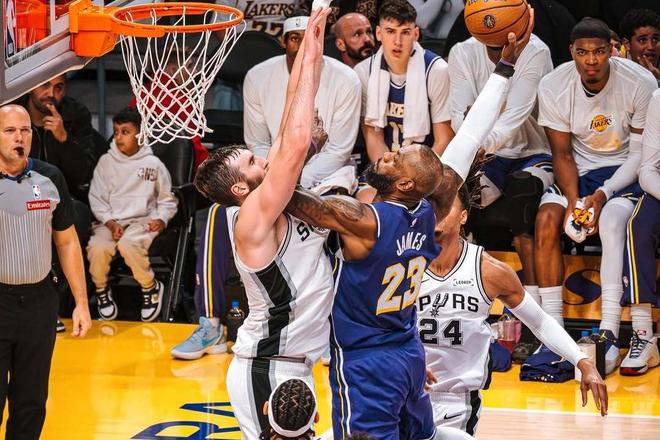 不过,虽说马刺赢球,但这场比赛的热度还是被湖人队给拿走了。或者准确来说,是被湖人队内的那个41岁的老将给抢走了。至于为何,相信看过这场比赛的球迷都知道。这场比赛进行到一半的时候,詹姆斯持球突然加速,面对着科内特的防守丝毫不惧,强势起飞隔扣得手!