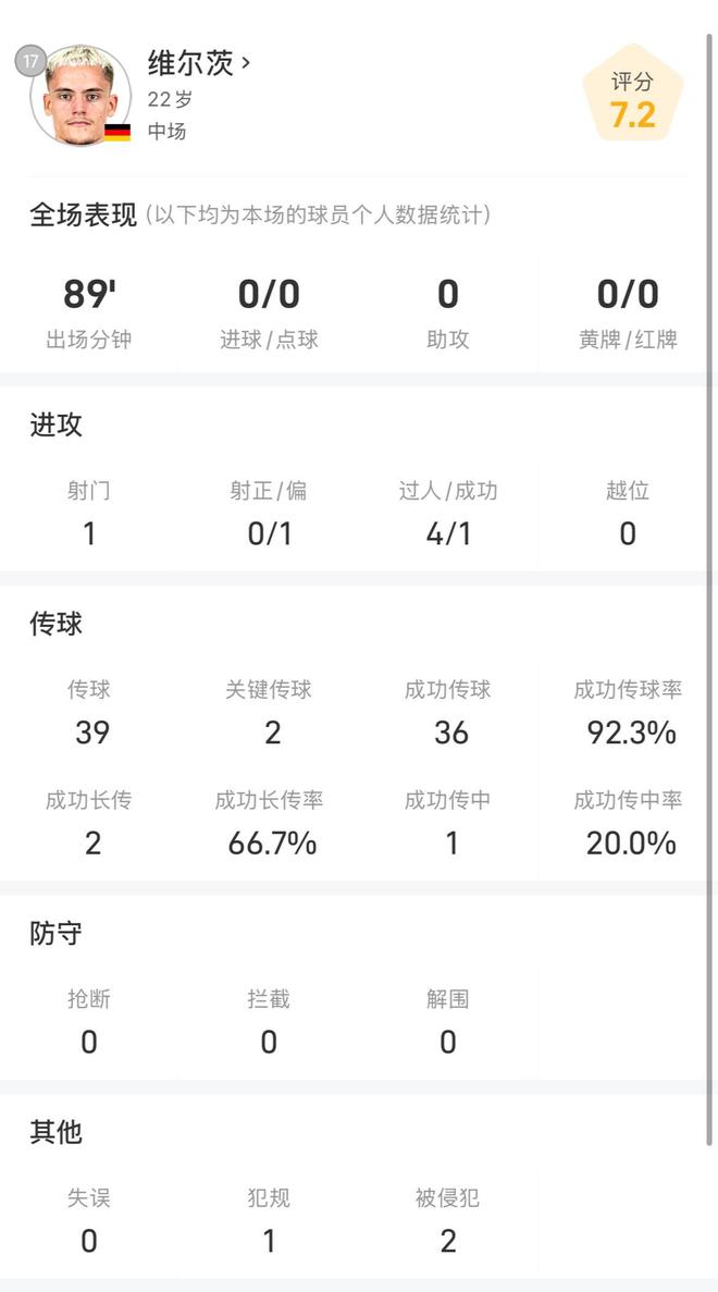 此外,维尔茨贡献了39次传球,成功率92.3%,5次传中成功1次,3次长传成功2次,另外还有1次犯规和2次被侵犯。赛后机器评分7.2分。