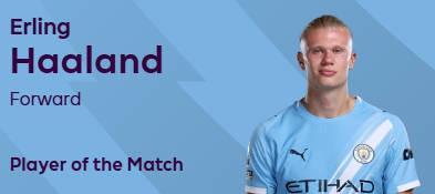本场比赛,哈兰德先是在第58分钟接到尼科-奥赖利的传中头球破门,接着在第63分钟接到萨维尼奥的回传球后低射打入进球,帮助球队取得2-0领先。赛后,哈兰德以95%的得票率当选本场比赛最佳球员。