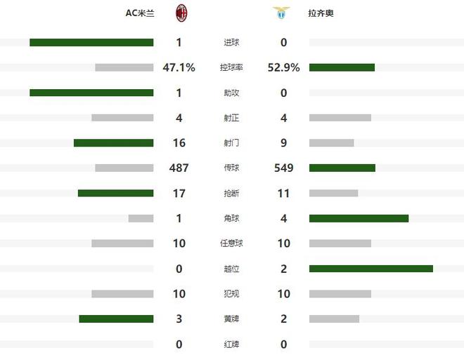 本场比赛AC米兰虽然是主场作战,但是表现并不好,上半场更是没有一脚中目标的射门,靠着迈尼昂的神勇发挥,才没有陷入落后的不利处境之中,不过下半场莱奥爆发,打入全场唯一进球,帮助AC米兰1-0复仇蓝鹰拉齐奥。